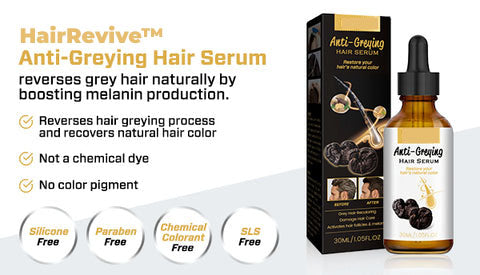 היפרדו מסימני הזמן וחזרו בזמן. HairRevive™ סרום שיער אנטי-אפור הוא הסוד שלך להפיכת השעון לשיער אפור. עם כל טיפה, הסרום הקסום הזה מחדיר לשיער תערובת עשירה של חומרים מזינים, עובד עמוק בתוך השורשים כדי להחזיר את הצבע הטבעי.