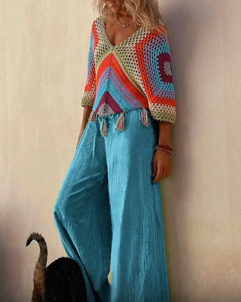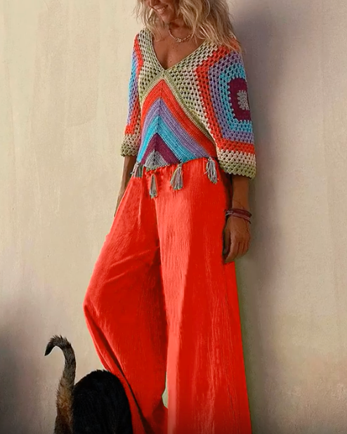 שחררי את הצד הבוהמי שלך עם הטופ הסרוג של Sunshine Chic™ והמכנסיים התואמים. אפשרי להדפס היפה והצבעוני להעביר אותך בחזרה לשנות ה-70 ולהרגיש את הוויברציות החיוביות המוקרונות מהתלבושת המהממת הזו.